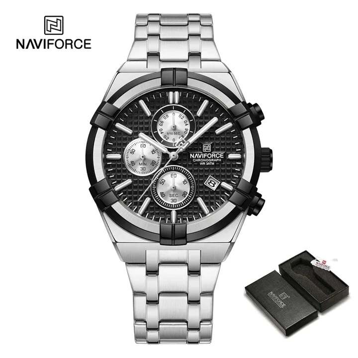 Built with a durable alloy case, stainless steel band, and strong Hardlex glass dial window, the NAVIFORCE NF8042 stainless steel watch offers durability and comfort. With useful features like chronograph function, complete calendar, shock resistance, and 3Bar water resistance, this watch is perfect for business style, daily use, formal wear, and as a stylish gift for men.