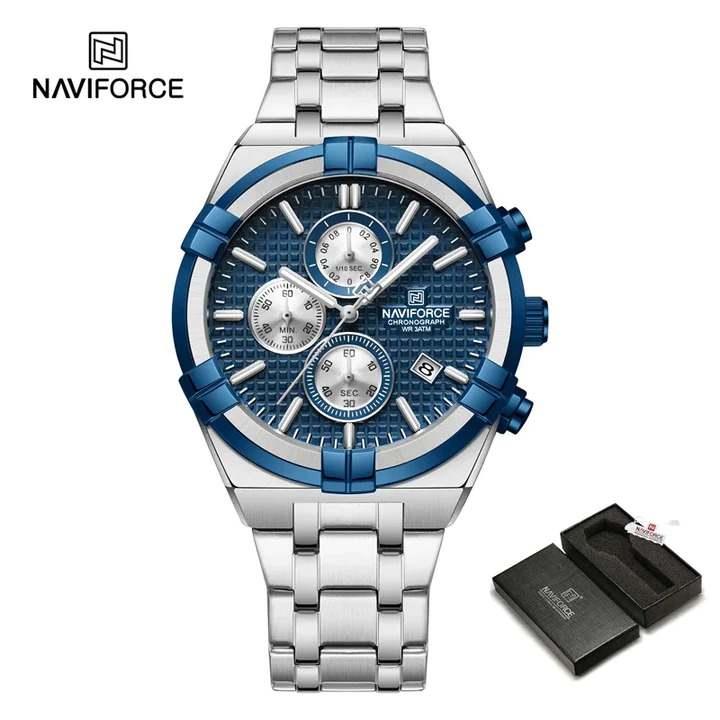 Built with a durable alloy case, stainless steel band, and strong Hardlex glass dial window, the NAVIFORCE NF8042 stainless steel watch offers durability and comfort. With useful features like chronograph function, complete calendar, shock resistance, and 3Bar water resistance, this watch is perfect for business style, daily use, formal wear, and as a stylish gift for men.