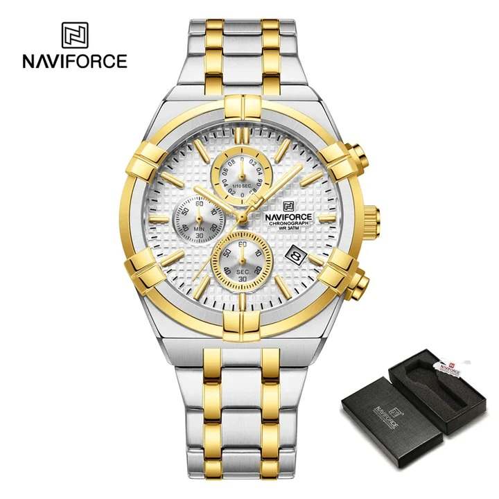 Built with a durable alloy case, stainless steel band, and strong Hardlex glass dial window, the NAVIFORCE NF8042 stainless steel watch offers durability and comfort. With useful features like chronograph function, complete calendar, shock resistance, and 3Bar water resistance, this watch is perfect for business style, daily use, formal wear, and as a stylish gift for men.
