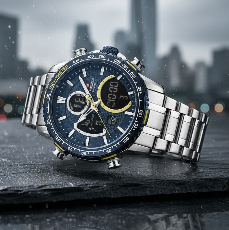 Upgrade your look with the NAVIFORCE NF9182 men's watch, designed for men who want a perfect combination of sporty design and modern technology. This analog and digital dual display watch offers a bold appearance with multiple useful features, making it ideal for both everyday wear and active lifestyles.