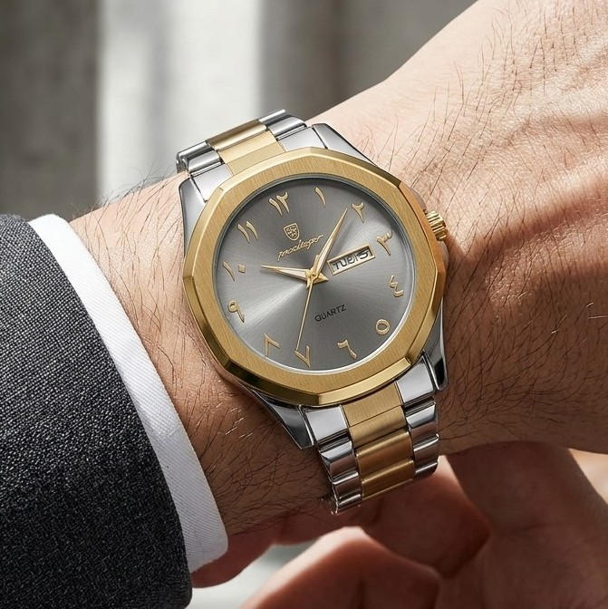 ফ্যাশন ও ক্যাজুয়াল স্টাইলের স্টেইনলেস স্টিল নির্মিত প্রিমিয়াম পুরুষদের কোয়ার্টজ ঘড়ি। স্টাইলিশ ডিজাইন, দৈনন্দিন ব্যবহার এবং হালকা পানিতে ব্যবহারের জন্য উপযোগী।
