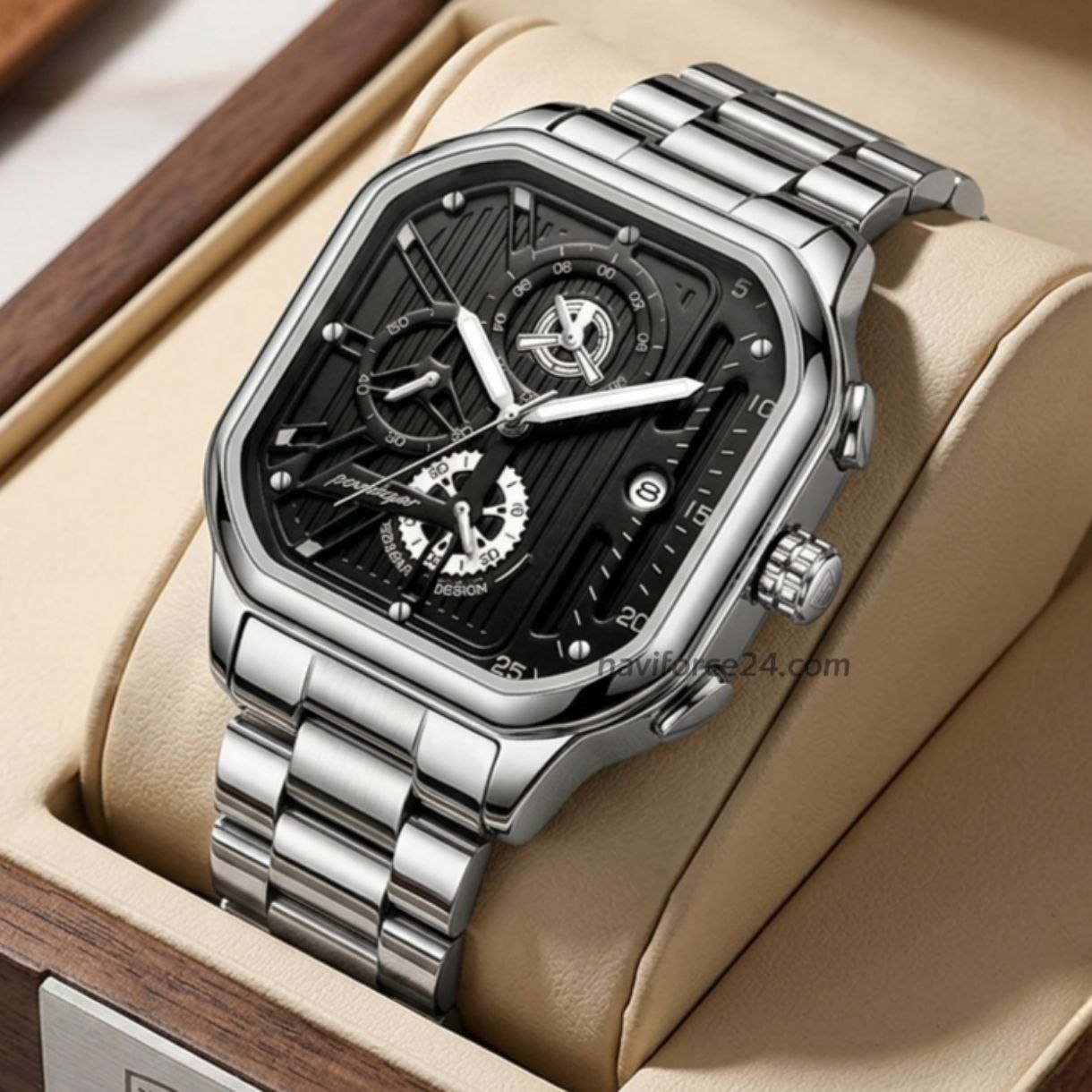 - Feature: STOP WATCH,Shock Resistant,Luminous,Auto Date,Chronograph,Complete Calendar,Diver,Water Resistant,swim,luminous hands